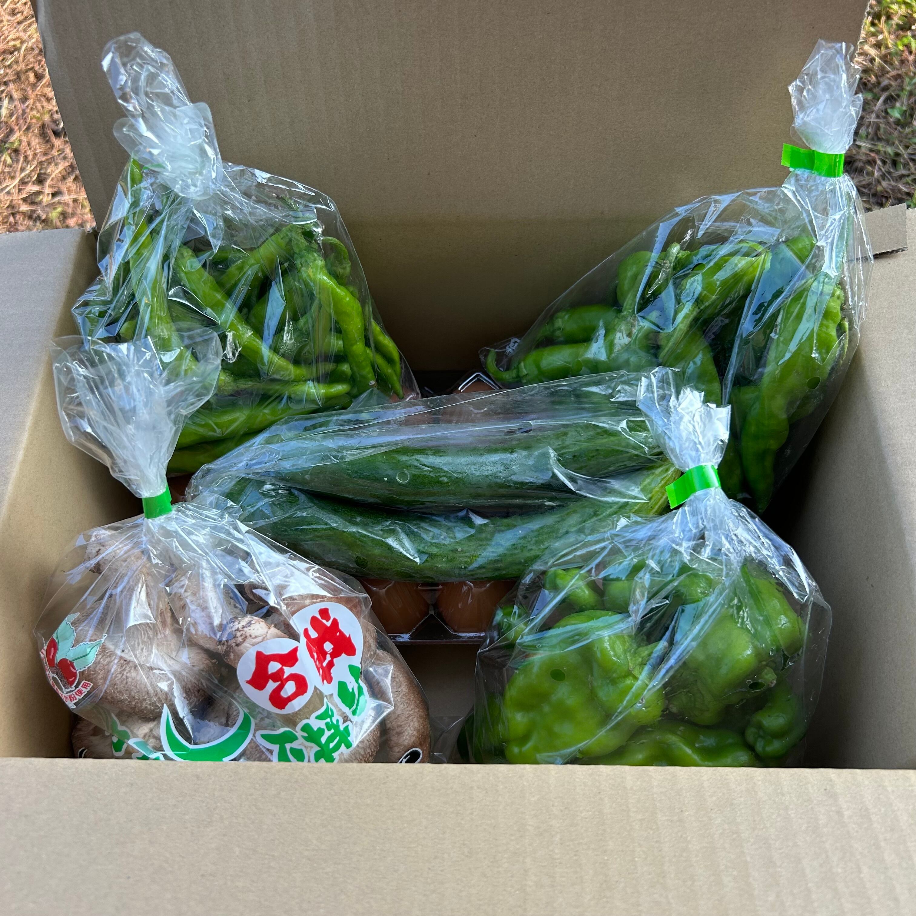 きゅうり/ピーマン/ししとう/万願寺とうがらし/しいたけ(菌床)/卵 M15個